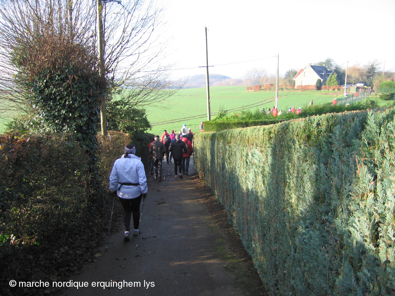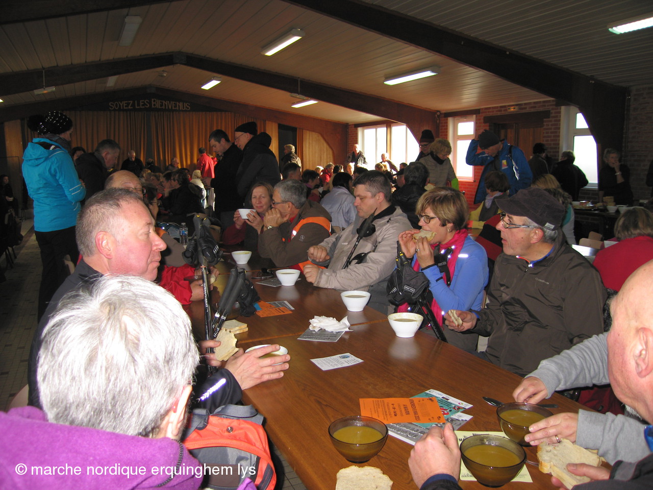 19 marcheurs nordiques d'Erquinghem/lys étaient parmi les 370 randonneurs ce matin à Flêtre. Le circuit a commencé dans la brume sur une chaussée glissante puis au fur et à mesure de l'ascension du mont des Cats, le soleil nous a accompagné. La suite ressemblait beaucoup a un trail dansla boue (tout le monde a préféré la boue à la route) seulement une seule chute : mais non Johan ce n'était pas du rugby ! La joie et la bonne humeur nous ont fait tout oublier. Un bol de soupe et un sandwich (fromage ou pâté) nous ont réconfortés.