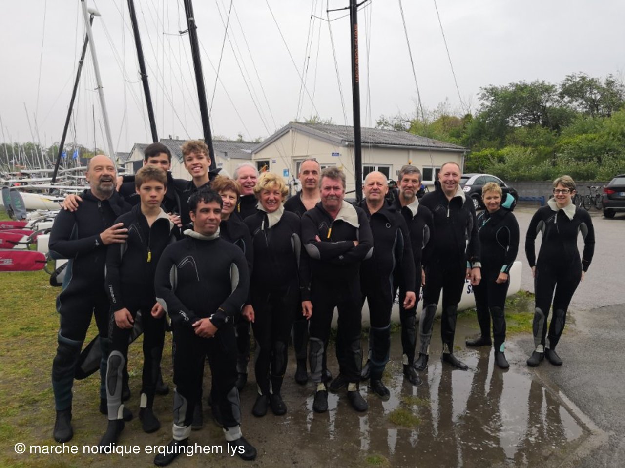 15 courageux se sont mis à l'eau pour cette initiation au longe cote à Leffrinckoucke. il n'étaient pas plus mouillés que les marcheurs car malheureusement il pleuvait ce jour là.